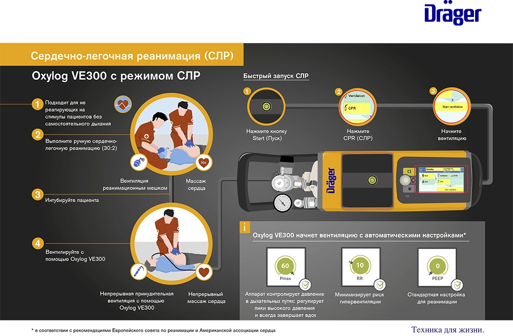 Oxylog VE300 поддерживает и облегчает проведение сердечно-лёгочной реанимации, освобождая руки медицинского работника. Переход в режим сердечно-лёгочной реанимации осуществляется одним нажатием кнопки и запускается мгновенно. Аппарат сам скорректирует предварительные настройки, а специалист сможет полностью сосредоточиться на пациенте.