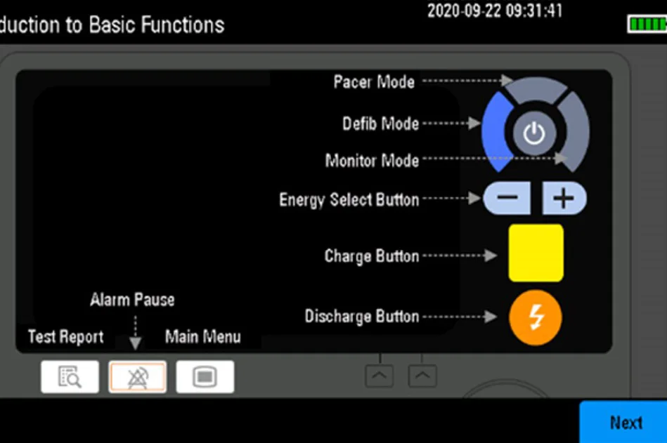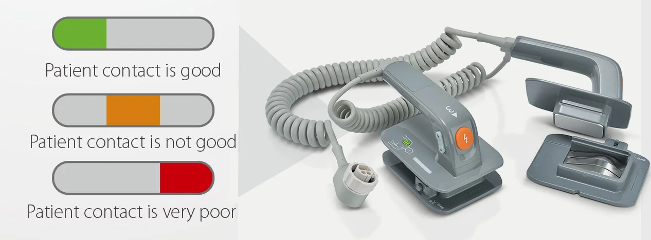Кнопки для выбора мощности, зарядки и подачи разряда повышают удобство использования для врачей. Индикаторы контакта с пациентом как на манипуляторе, так и на экране позволяют визуально контролировать контакт с пациентом для обеспечения эффективности выписки.