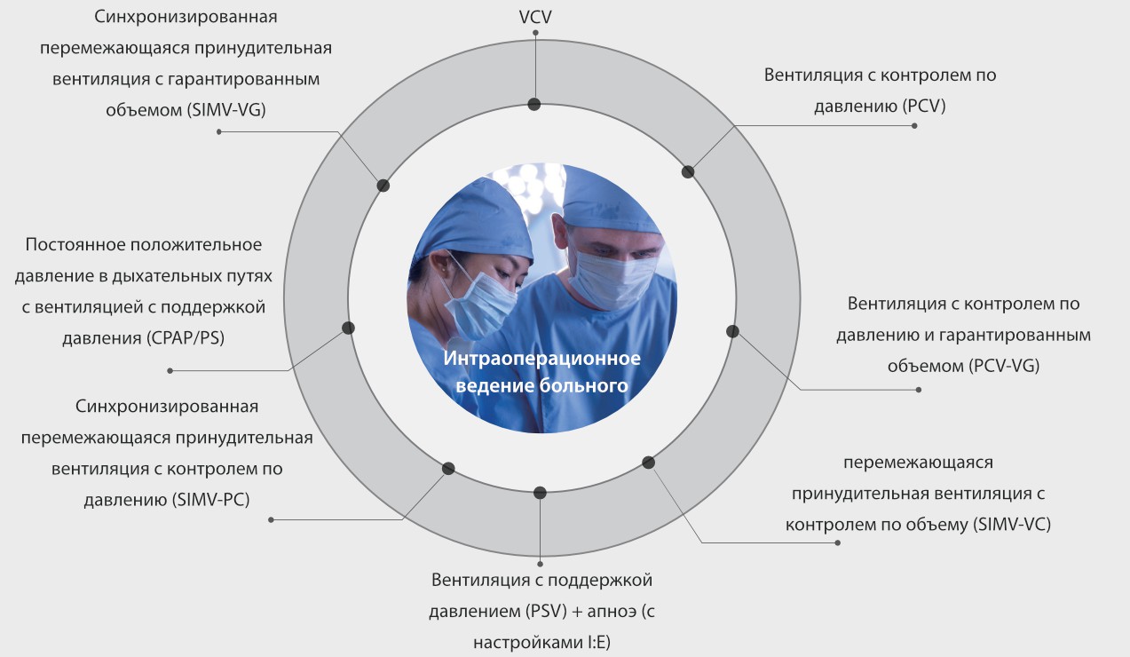 Полный комплекс режимов вентиляции для использования в медицинских целях в отделении интенсивной терапии, который соответствует вашим запросам на всех этапах анестезии.