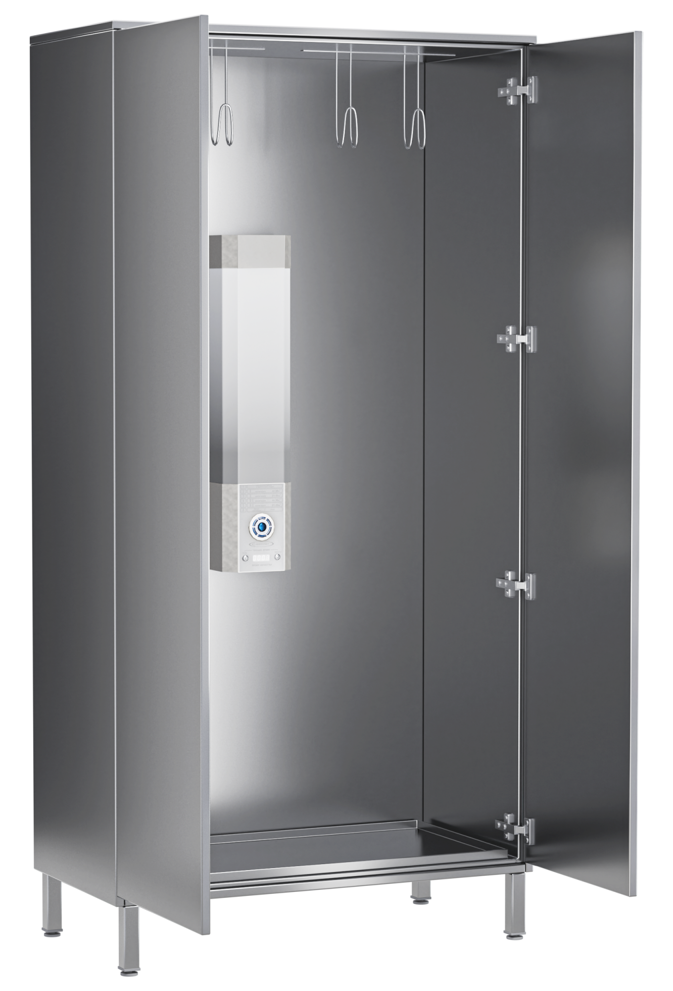 Ультрафиолетовая бактерицидная лampa обеспечивает постоянное обеззараживание внутреннего пространства. Система принудительной циркуляции воздуха способствует равномерной сушке эндоскопов. Четыре крючка гарантируют правильное вертикальное положение оборудования согласно рекомендациям производителей. Электронный блок управления позволяет контролировать режимы работы системы.