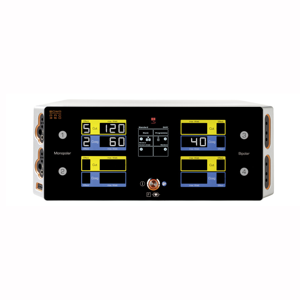 Электрокоагулятор BOWA ARC 350 имеет стеклянную сенсорную панель, которая разделена на четыре квадранта, логически связанных с четырьмя разъемами на боковых сторонах: как только Вы подключите какой-либо инструмент, например, к биполярному разъему вверху справа, ярко высветится верхний правый квадрант.