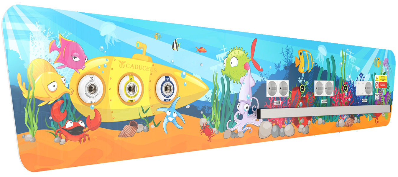 Детские однорядные медицинские консоли CADUCEUS для отделений реанимации и интенсивной терапии используются для подвода не более 3-х различных видов медицинских газов и электропитания к койкам маленьких пациентов. Консоли выполнены с использованием декоративных дизайнерских элементов с детскими мотивами и комплектуются быстроразъемными соединениями медицинских газов и вакуума, электрическими розетками 220 В, а также гильзами защитного соединения.