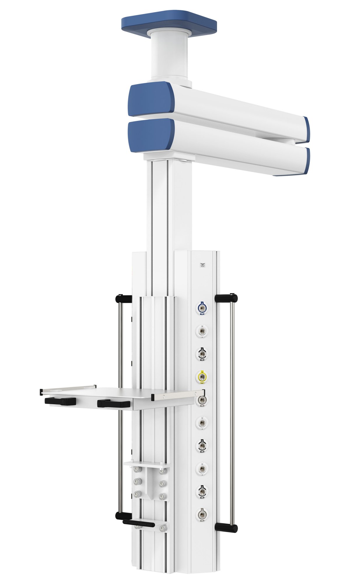 с 2-мя поворотными плечами, длиной до 1200 мм каждое, и вращающимся вертикальным шкафом источников медицинских газов и электропитания, позволяет эффективно организовать рабочее место медицинского персонала с возможностью свободного доступа к пациенту.
