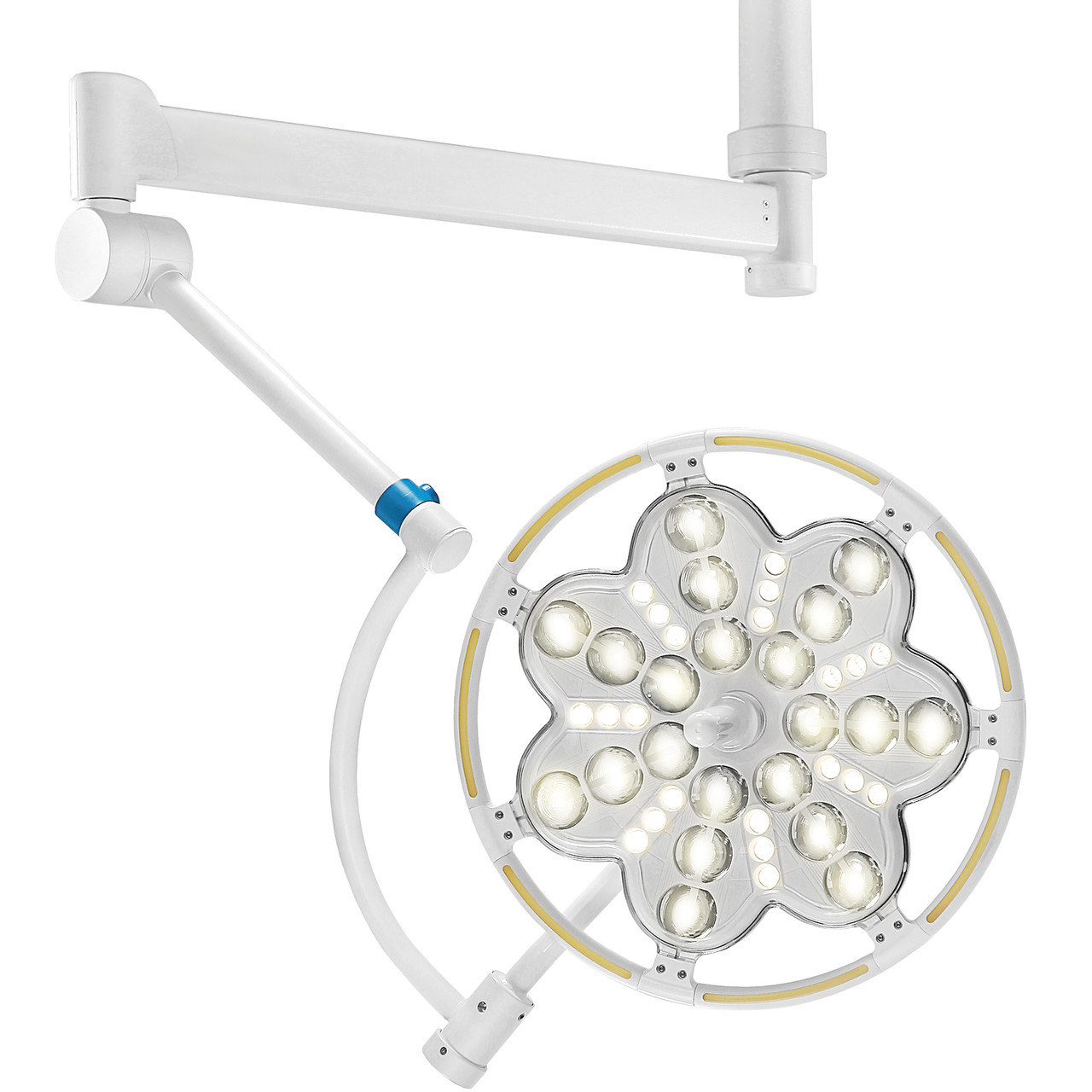В хирургическом медицинском операционном светильнике Эмалед 300 используются белые светодиоды высокой мощности, которые разделяются на 2 группы. Первая группа светодиодов формирует сфокусированный световой поток, который обеспечивает глубокое освещение операционного поля. Для повышения эффективности работы светодиодов этой группы мы используем специальные отражательные элементы, которые предотвращают потерю света. Вторая группа светодиодов формирует широкий световой поток, который обеспечивает освещение операционного поля в широкой площади. Этому способствуют оптические элементы с полным внутренним отражением света.