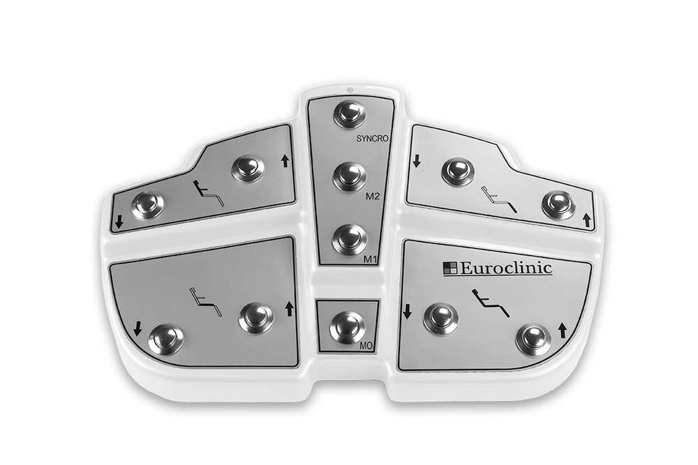 Педаль управления креслом Оснащена запоминающим устройством с памятью на 4 позиции: 2 положения, выбранные оператором; синхронное положение спинки и подставки для ног с помощью кнопки «synchro» и возвращение в положение покоя («нулевое» положение) для входа/выхода пациента. Опционально - использование беспроводной педали.