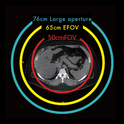 Широкая апертура гентри позволяет снизить уровень тревожности и упростить обследование пациентов, страдающих клаустрофобией. Для клинического использования большое пространство в гентри дает возможность сканировать пациента с применением дополнительных устройств, а также проводить малоинвазивные вмешательства под контролем КТ.