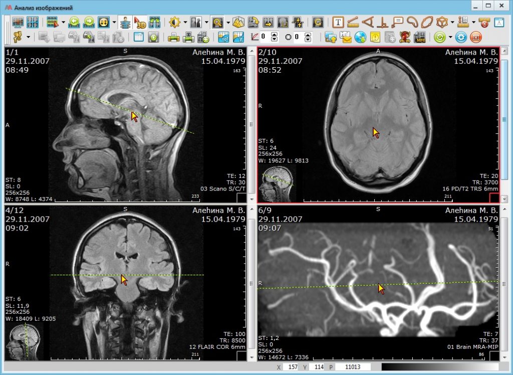 - Функция 3D курсора (автоматическое указание местоположения выбранной точки изображения на изображениях других серий с синхронизацией при навигации)
