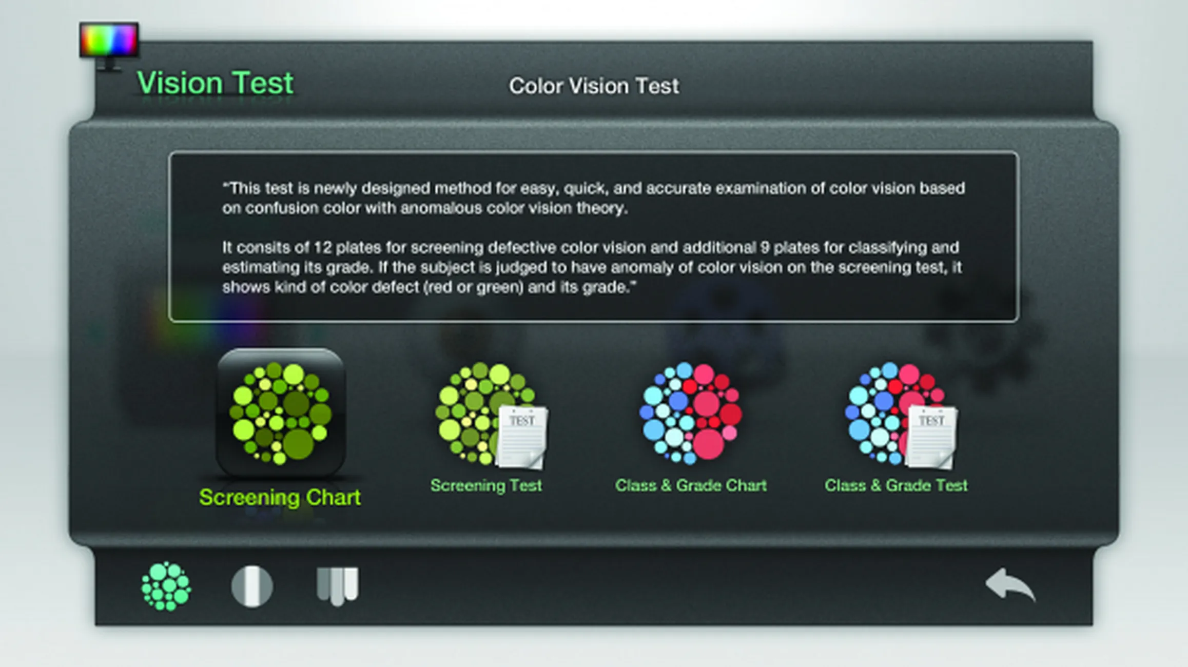 Для проверки цветовостприятия в программе прибора предусмотрен профессиональный тест, состоящий из 85 оттенков, и более простой тест из 15 оттенков.
