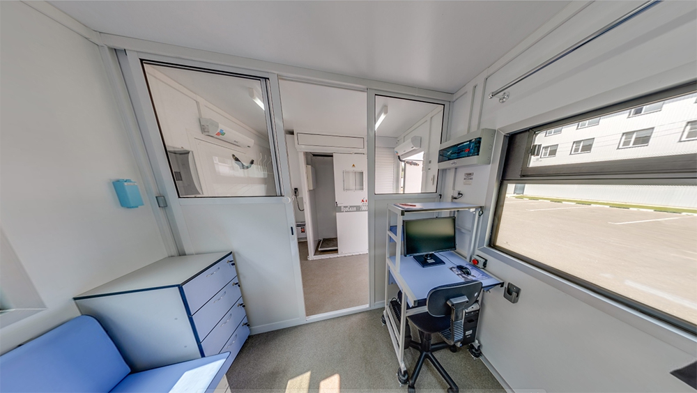 В процедурной находится цифровой флюорограф серии ПроСкан или ПроМатрикс. Пациенты попадают в помещение через одну дверь, а покидают его через другую. Это позволяет резко увеличить пропускную способность флюорографа. Одновременно в процедурной комнате могут переодеваться до трех человек. Над каждой дверью установлена тепловая завеса для использования кабинета в холодное время года.