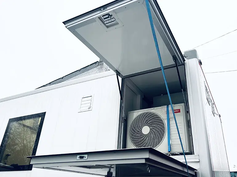 Передвижной флюорограф/маммограф оснащен автономным генератором, климат-контролем, состоящим из приточно-вытяжной вентиляции, мультисплит системы кондиционирования, конвекционными обогревателями и воздушной завесой. Во время перемещения комплекса отопление помещений осуществляется автономным воздушным отопителем на дизельном топливе. Процедурный отсек имеет рентген защиту эквивалентную 2мм свинца, обеспечивающую самый высокий уровень защиты персонала и населения. Автоматизированное рабочее место рентгенлаборанта оснащено доступом в сеть Internet. Отличительной особенностью передвижных реннтгендиагностических комплексов производства ООО «ДжиСиМед», укомплектованных маммографическим и флюорографическим аппаратом, является возможность осуществления рентгенографии при работе комплекса от «слабых» электросетей или от генератора. Источник двойного преобразования мощностью от 10кВА обеспечивает питание маммографического или флюорографического аппарата высококачественным переменным напряжением независимо от качества напряжения на входе в передвижной рентгенографический кабинет.