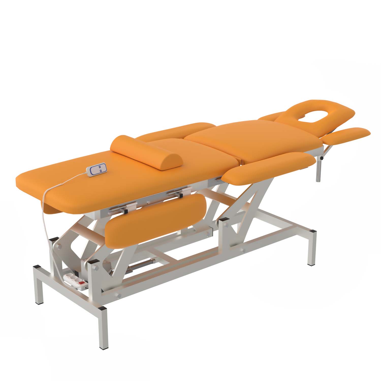 Основная особенность массажного стола с электроприводом — его улучшенный функционал. Данная модель состоит из 9 секций: подголовник, спинка, подставка для ног, и шесть подлокотников. Для регулировки положения стола присутствует электрический привод, управляемый с помощью ручной и ножной педали. Конструкторы предусмотрели всё для комфорта пациента и специалиста.