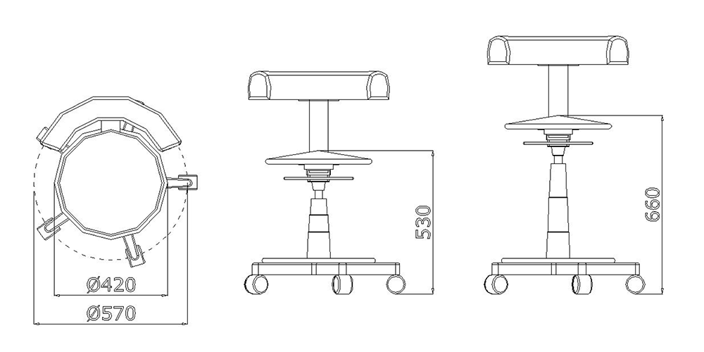 - Стул врача с кольцом-подставкой для ног, газовым подъемом, стальной конструкцией, поворотными колесами на 360 градусов, покрытием peltex, регулировкой по высоте с помощью газовой пружины, поворотом на 180 градусов и полностью регулируемой спинкой.