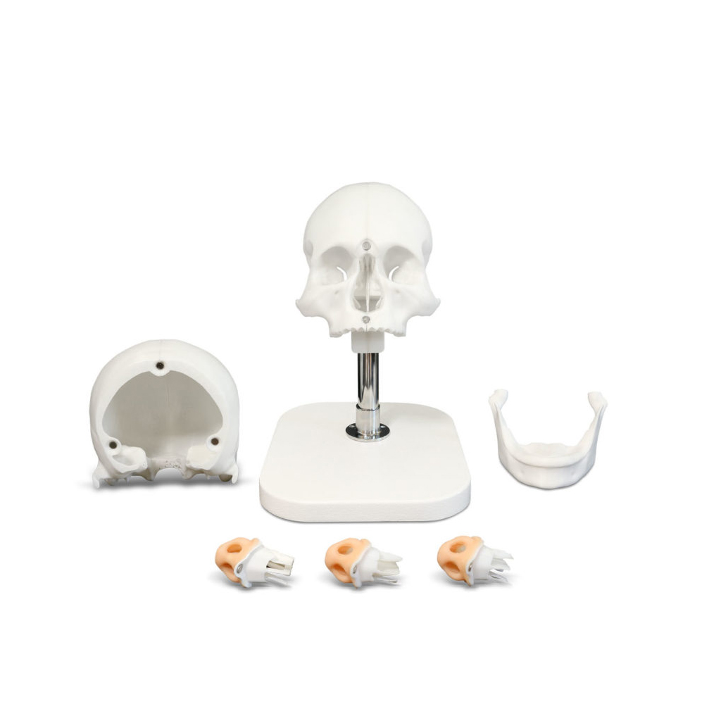 Лицевой отдел черепа на шарнире с подставкой устанавливается на рабочий стол. К лицевой части черепа крепится мозговая часть на магнитах, при этом шаровидная выемка совпадает с головкой шарнира. Далее присоединяется съемный элемент – пирамида и полость носа. В зависимости от отрабатываемого практического навыка, собирается набор инструментов. Проводится манипуляция или демонстрируется навык с визуальной оценкой правильности выполнения. Для контроля выполнения передней и задней тампонады, пункции верхнечелюстной пазухи мозговой отдел черепа снимается, и правильность навыка оценивается визуально, так как срез проходит во фронтальной плоскости в проекции задней стенки верхнечелюстной пазухи, хоан.