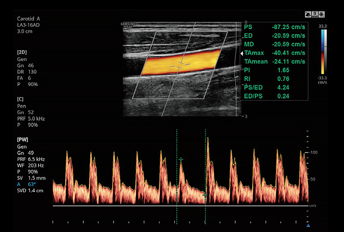 - Модуль Auto IMT - автоматическое вычисление комплекса интима-медиа общей сонной артерии (Intima Media Thickness). Данная оценка имеет большое значение для ранней диагностики атеросклероза и оценки риска развития инсульта и инфаркта миокарда.