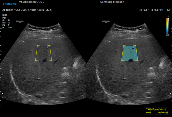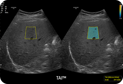 Количественное измерение жира в печени с помощью ультразвукового сигнала TAITM(визуализация ослабления тканей) обеспечивает количественное измерение ослабления тканей для оценки стеатотических изменений печени.