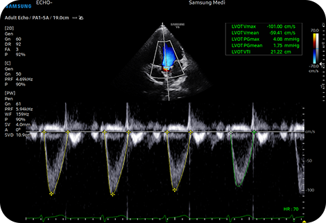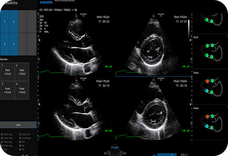 Инструмент автоматической отчетности для диагностики сердца HeartAssistTM, функция, основанная на технологии глубокого обучения, обеспечивает автоматическую классификацию ультразвукового изображения по видам измерений, необходимым для диагностики сердца, и предоставляет результаты измерений.
