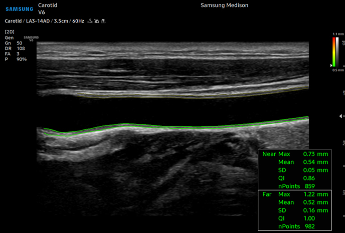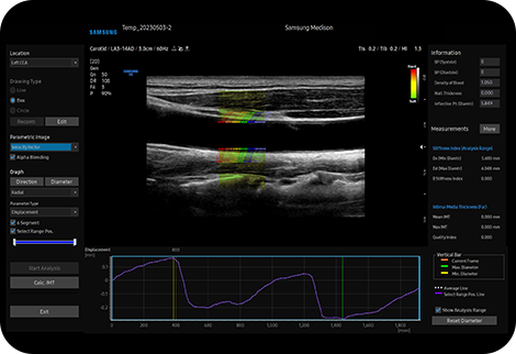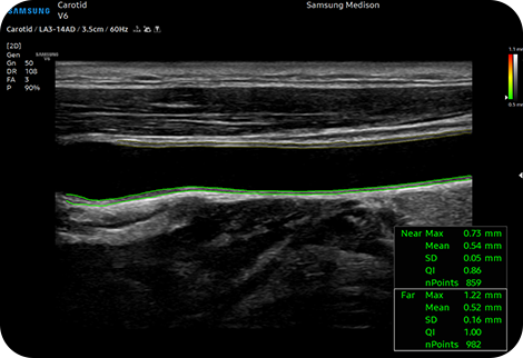 Измерьте IMT одним щелчком мыши AutoIMT+ представляет собой инструмент скрининга для анализа потенциального риска сердечно-сосудистых заболеваний у пациента. Она позволяет легко измерять толщину интимы-медиа как передней, так и задней стенки общей сонной артерии одним нажатием кнопки.