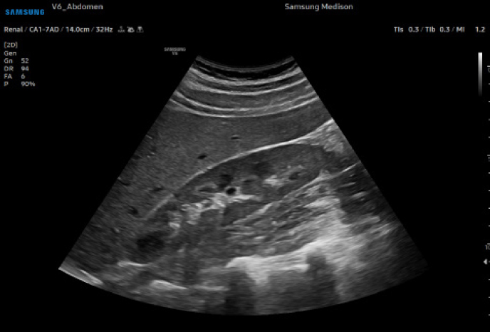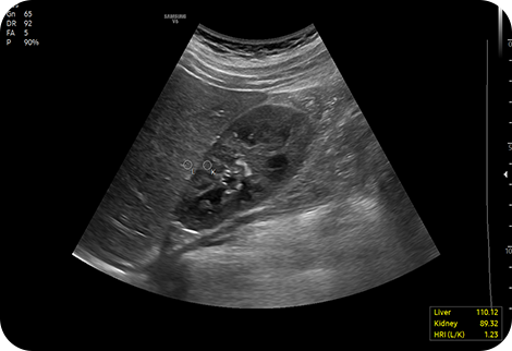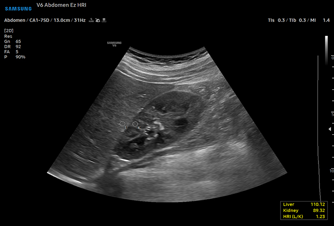 Гепато-почечный индекс с автоматизированной рекомендацией рентабельности инвестиций HRI (гепато-почечный индекс) - это показатель для количественной оценки стеатоза печени путем сравнения эхогенности паренхимы печени и коркового вещества почек. EzHRITM обеспечивает 2 ROI на паренхиме печени и корковом веществе почек и обеспечивает коэффициент HRI.