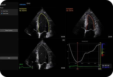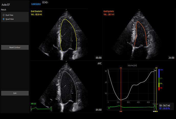 Измерение фракции выброса левого желудочка AutoEF - это функция, которая позволяет удобно измерять и количественно определять долю выброса. При выборе трех точек левого желудочка рассчитывается объем в конечной систолической и конечной диастолической точках левого желудочка, что помогает быстро и эффективно оценить функцию сердца.