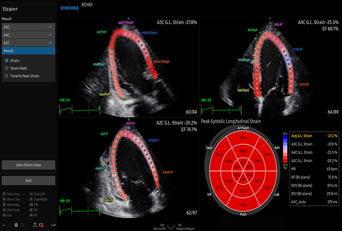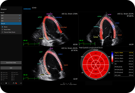 Количественная оценка движения стенки левого желудочка Strain+ представляет собой количественный инструмент для измерения общего и сегментарного движения стенки левого желудочка (ЛЖ). Три стандартных вида левого желудочка и "Яблочко" отображаются на четырехэкранном экране для удобства оценки функции левого желудочка.