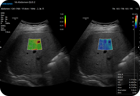 Отображение и количественная оценка жесткости тканей неинвазивным методом S-Shearwave ImagingTM позволяет проводить неинвазивную оценку состояния жестких тканей в различных областях применения. Эластограмма с цветовой маркировкой, количественные измерения, опции отображения и выбираемые пользователем функции ROI полезны для точной диагностики.