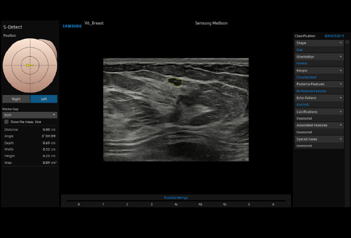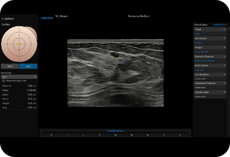 Анализируйте выбранные поражения молочной железы и сообщайте об оценке состояния молочной железы S-DetectTM,³ для молочной железы анализирует выбранные поражения при ультразвуковом исследовании молочной железы и отображает данные анализа, применяет BI-RADS ATLAS * для предоставления стандартизированной отчетности; и помогает в диагностике благодаря упрощенному рабочему процессу.