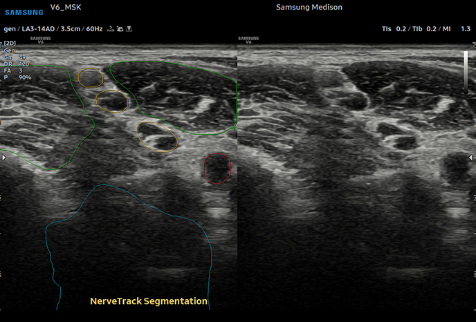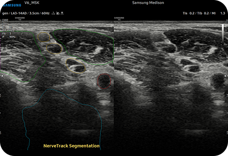 Автоматическое обнаружение нервов и отслеживание их состояния с помощью технологии искусственного интеллекта NerveTrackTM, функция, основанная на технологии глубокого обучения, определяет местоположение области нерва и предоставляет информацию о нем в режиме реального времени во время ультразвукового сканирования.