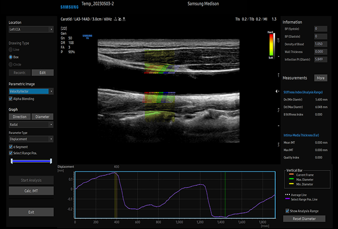 Выявляет функциональные изменения сердечно-сосудистых сосудов Артериальный анализTM обнаруживает функциональные изменения сосудов, предоставляя измеряемые значения, такие как жесткость, толщина интимы-медиа и скорость пульсовой волны в общей сонной артерии. Поскольку функциональные изменения происходят раньше морфологических, эта технология способствует раннему выявлению сердечно-сосудистых заболеваний.