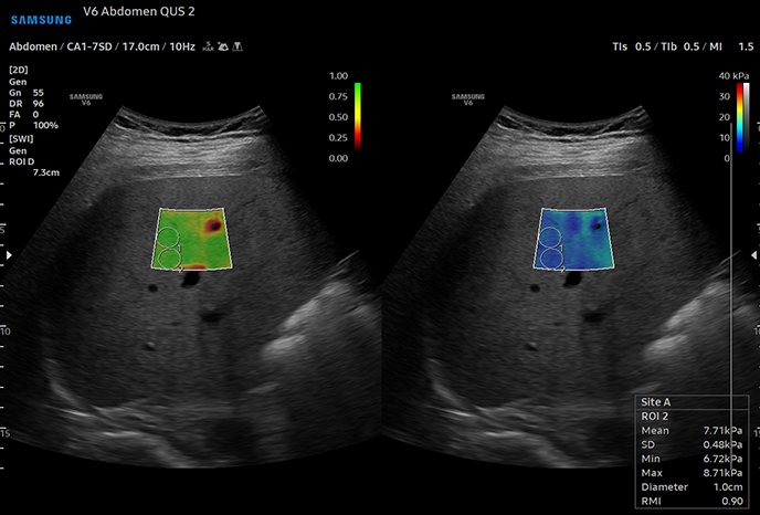 TSITM (визуализация распределения рассеяния в тканях) обеспечивает количественное измерение распределения рассеяния в тканях для оценки стеатотических изменений печени.