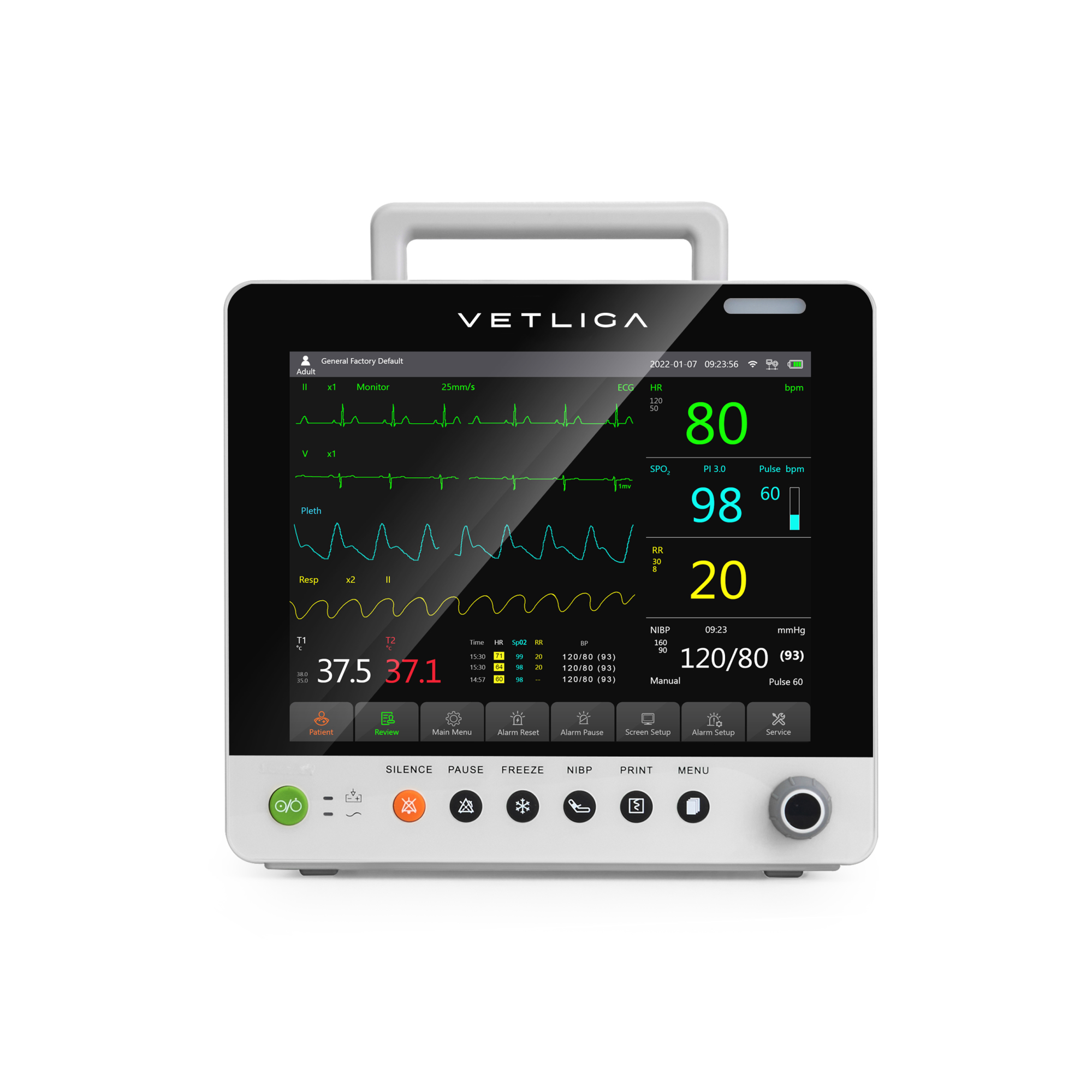 - Возможность расчетов концентрации лекарственных препаратов, отображения оксигенации картины насыщения крови кислородом в процессе дыхания, анализ сегмента ST, интерфейс с крупными символами, отображение сигналов кривых ЭКГ по всем доступным отведениям, ЭКГ, анализ нарушений сердечного ритма.